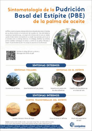La PBE es una de las mayores amenazas del cultivo de la palma de aceite en Colombia por sus efectos directos en la disminución de la producción. Esta enfermedad es causada por Ganoderma spp., y la mayoría de síntomas externos solo son visibles cuando el daño interno se encuentra en un estado muy avanzado, por lo que se le considera como un enemigo silencioso. Sin embargo, identificar sus síntomas permite establecer estrategias de manejo y control de las palmas infectadas e impedir el aumento del inóculo en las áreas con presencia de la enfermedad.